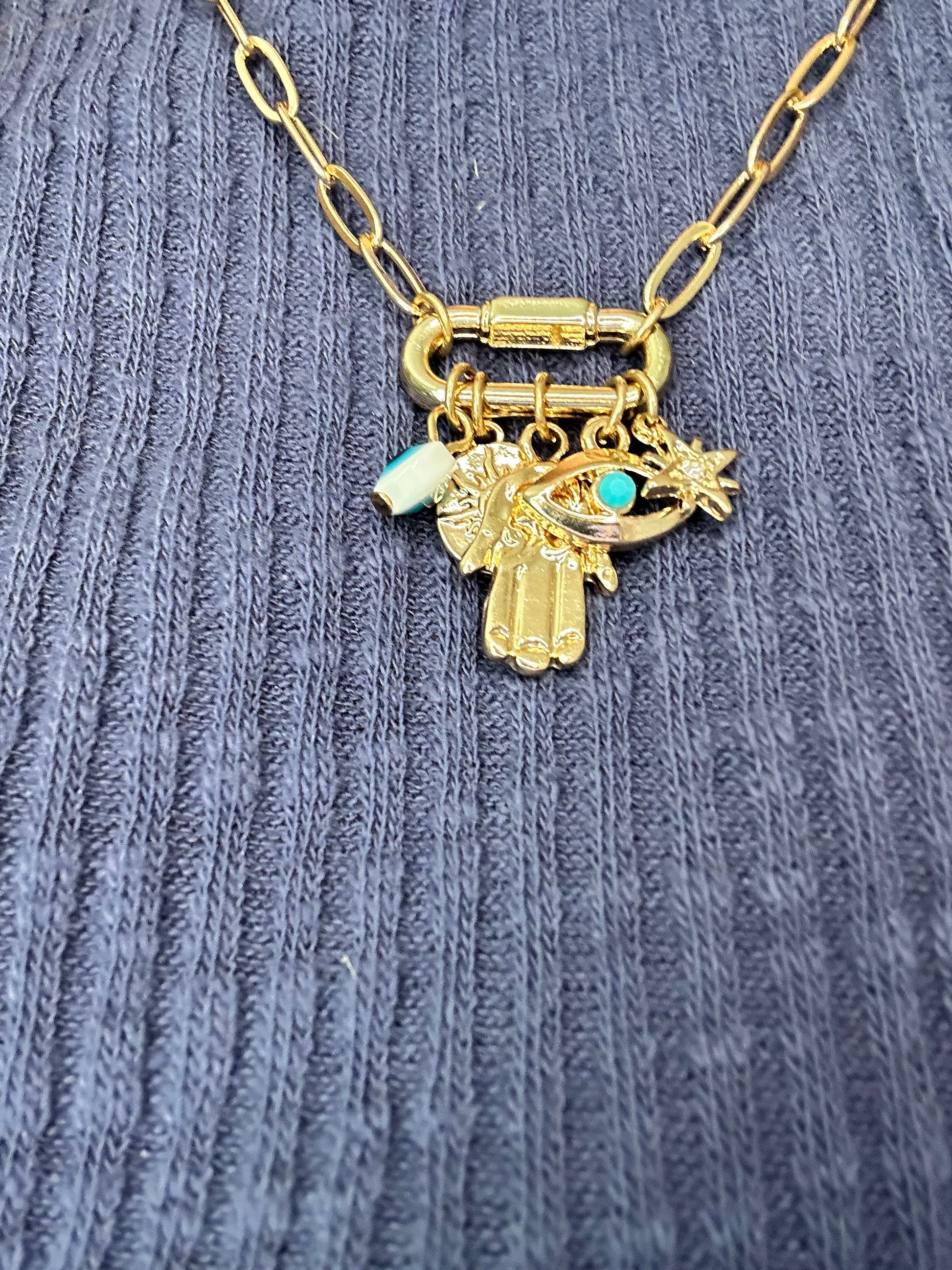 Link Chain Necklace with Evil Eye, Hamsa , Sun disc, Star & Crescent Moon Charms clustered on a Carabiner